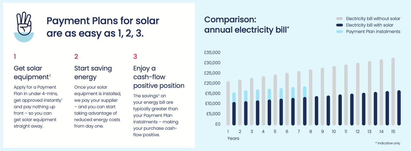 (1) Subject to credit criteria and approval. (2) Savings are indicative only and depend on several factors. Your solar specialist can discuss this with you. Smart Ease is a separate and unrelated entity to your solar and energy-efficiency equipment supplier and/or installer. Smart Ease solely provides payment solutions. Your equipment supplier and/or installer, not Smart Ease, is responsible for any regulatory approval, network connections, performance or service issues, product warranties or other benefits (as applicable) after installation. (3) 10-year terms available for Payment Plans over £200k or in special circumstances. (4) Seek independent financial advice to determine whether this applies to your organisation.