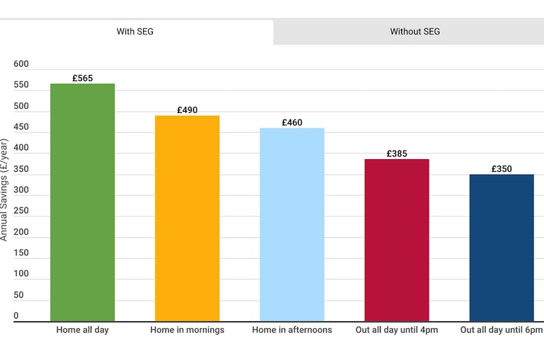 Graph showing Annual Savings of a 3.5 kW Solar PV System with Smart Export Guarantee (SEG) in London, South East England. Via Smart Energy Trust.