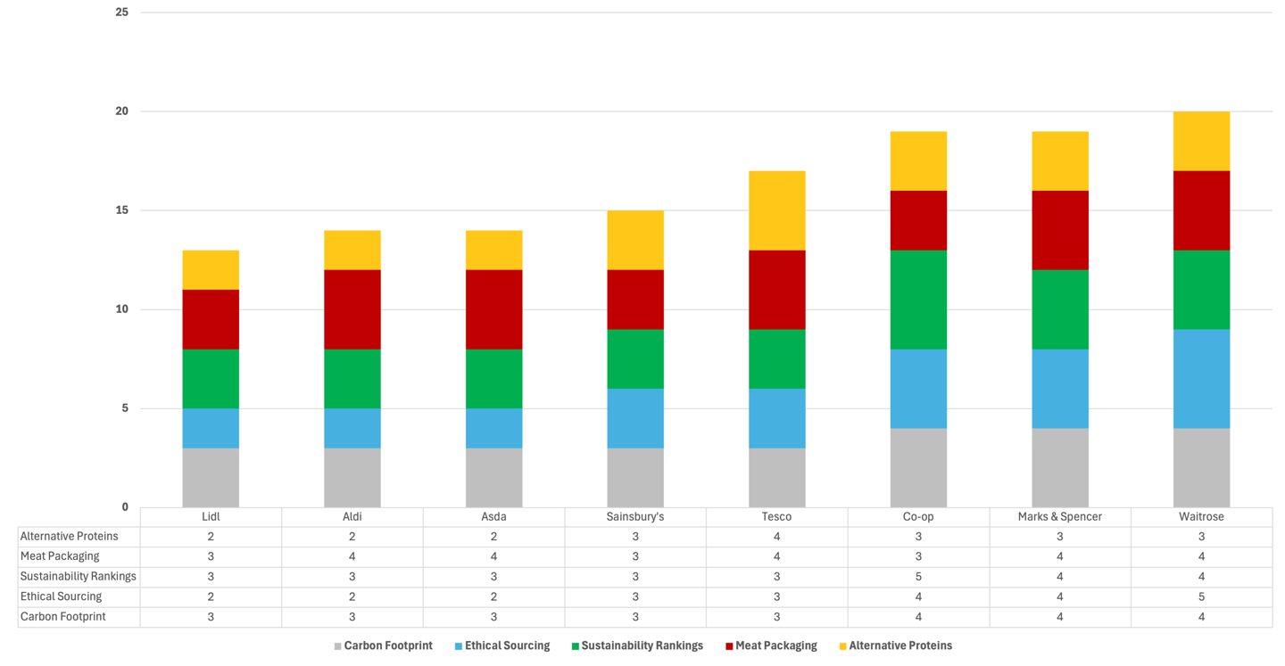 We wanted to know how humane and sustainable supermarkets are really being. For this, we looked at whether they have clear policies on animal welfare, like free-range or grass-fed standards. Do they partner with ethical farming certifications, such as RSPCA Assured or Soil Association? What about antibiotics and hormones—are they limiting their use? And how humane are their slaughter practices?